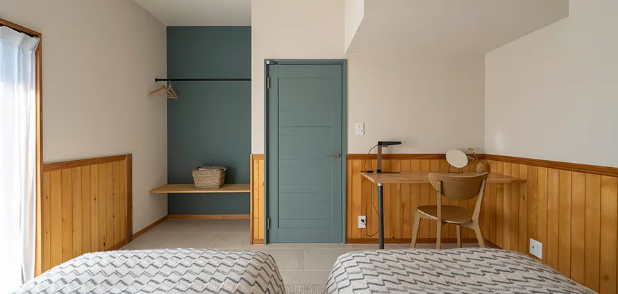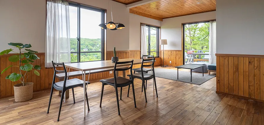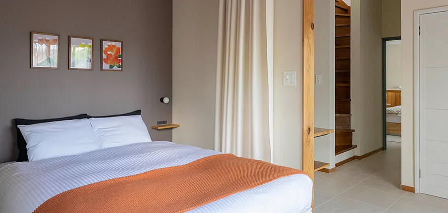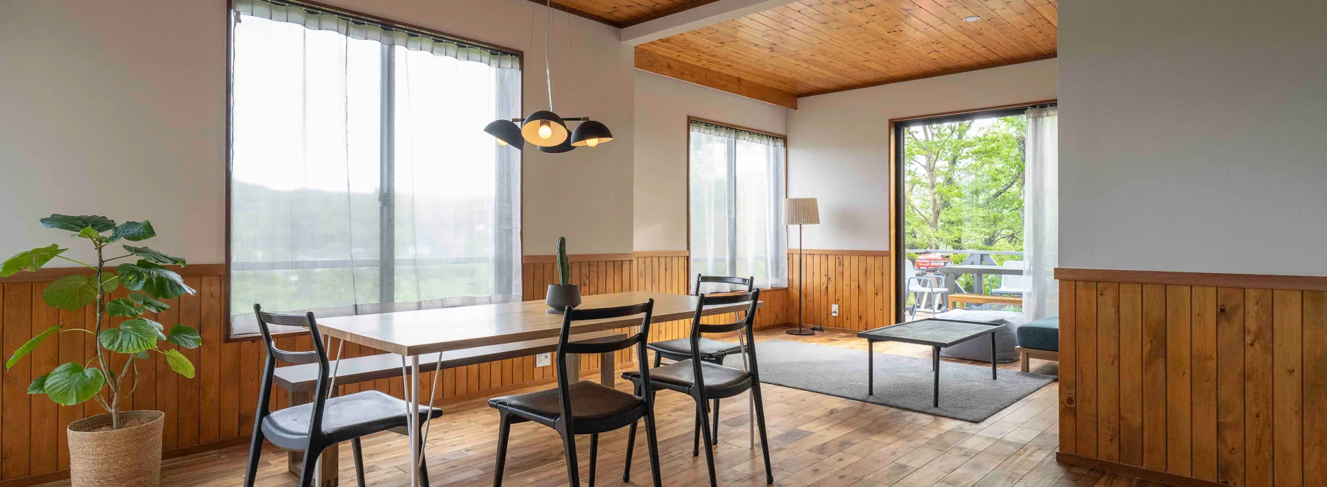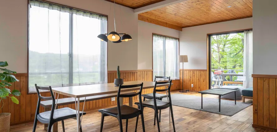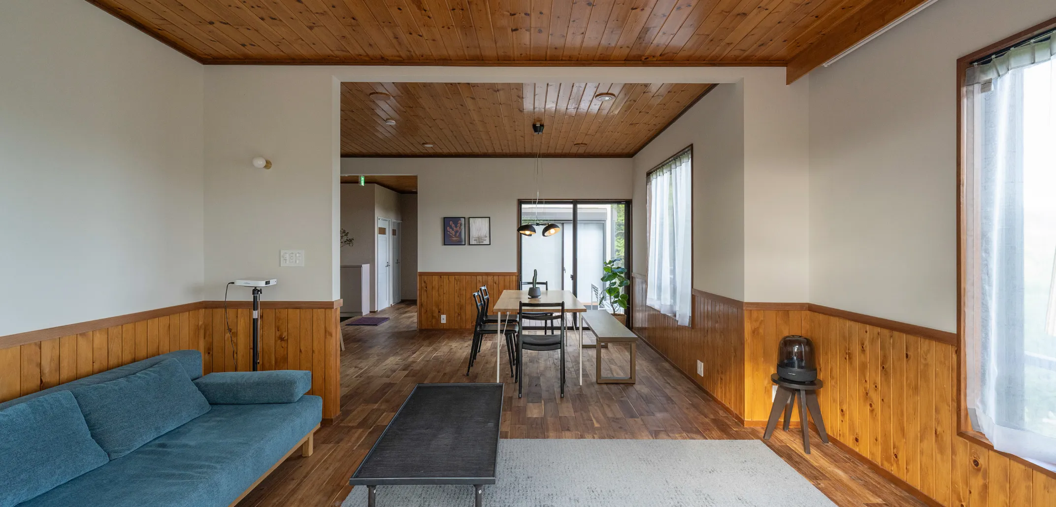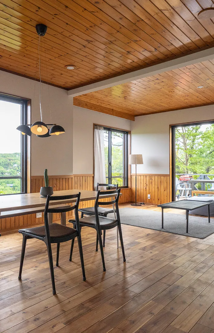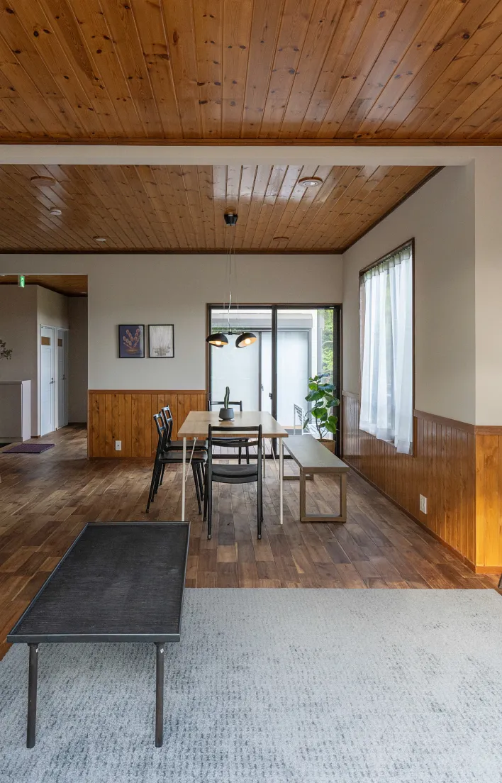 While preserving the warmth of the home’s natural wood finishes, we renovated by removing select walls and doors. The result is a layout that gently connects shared spaces and bedrooms—designed so that up to seven guests can comfortably come together while still enjoying their privacy.