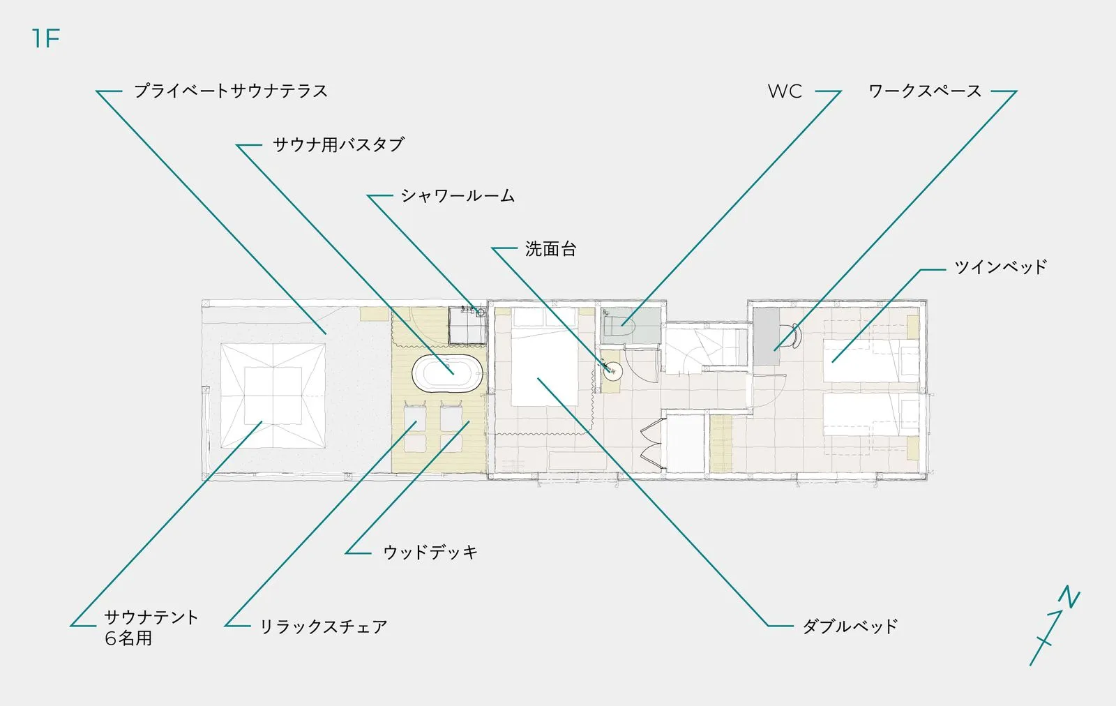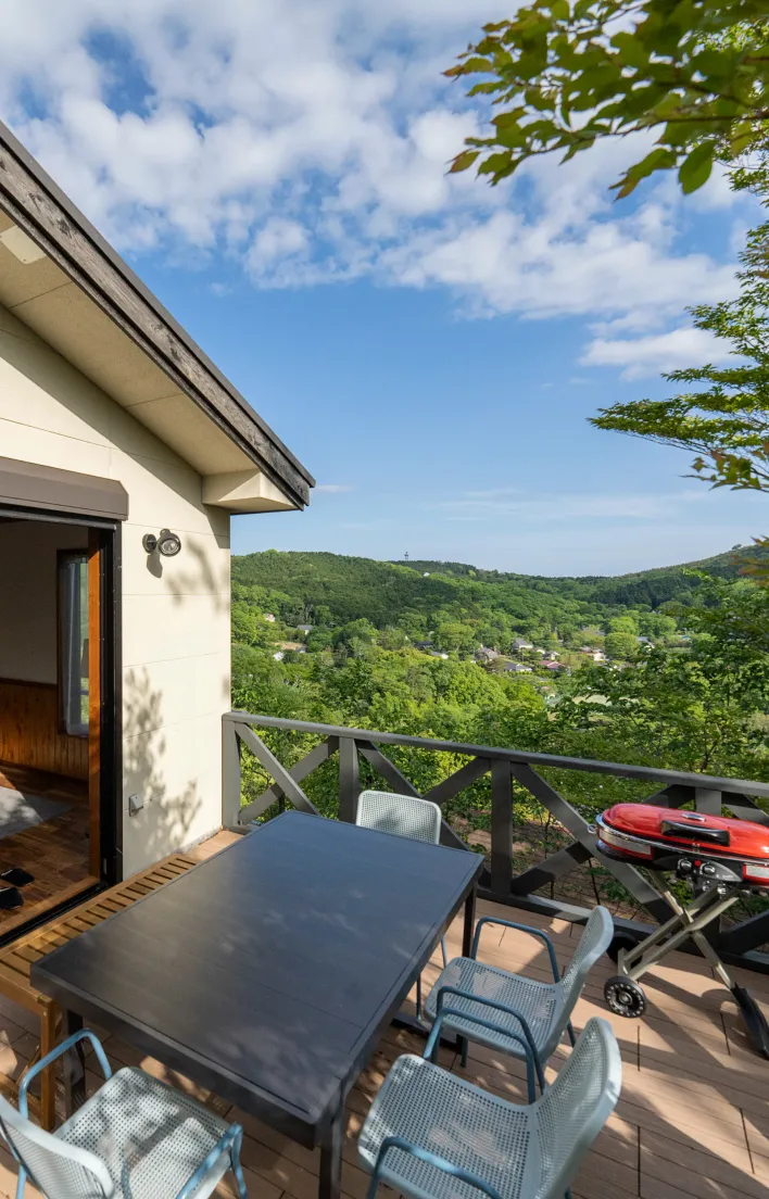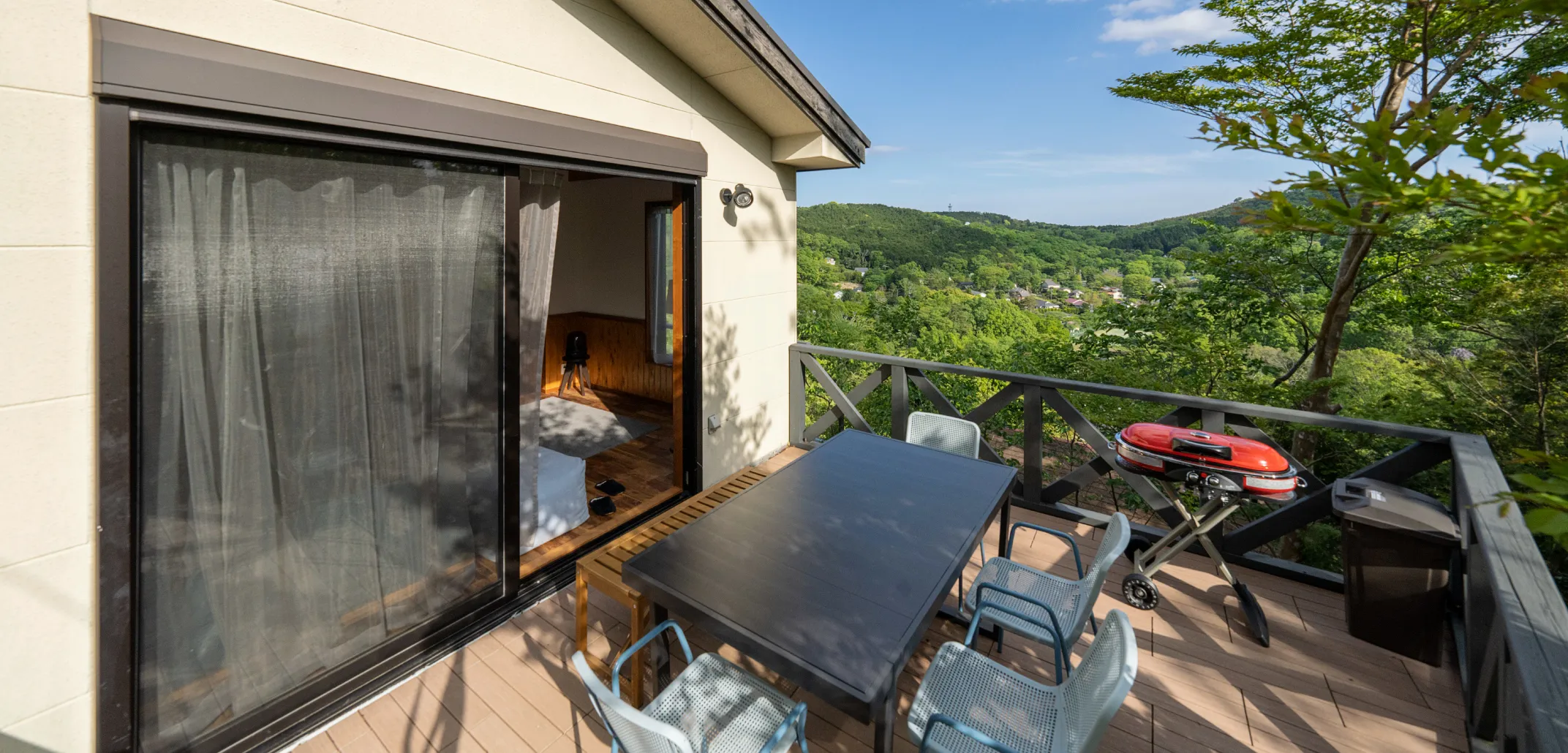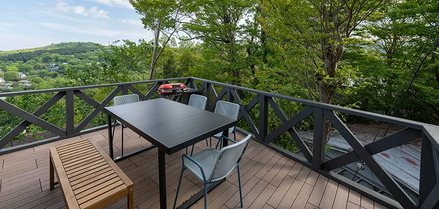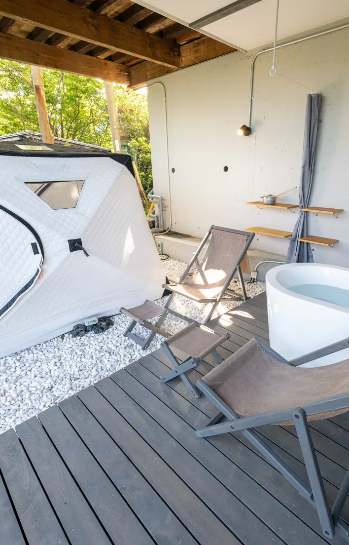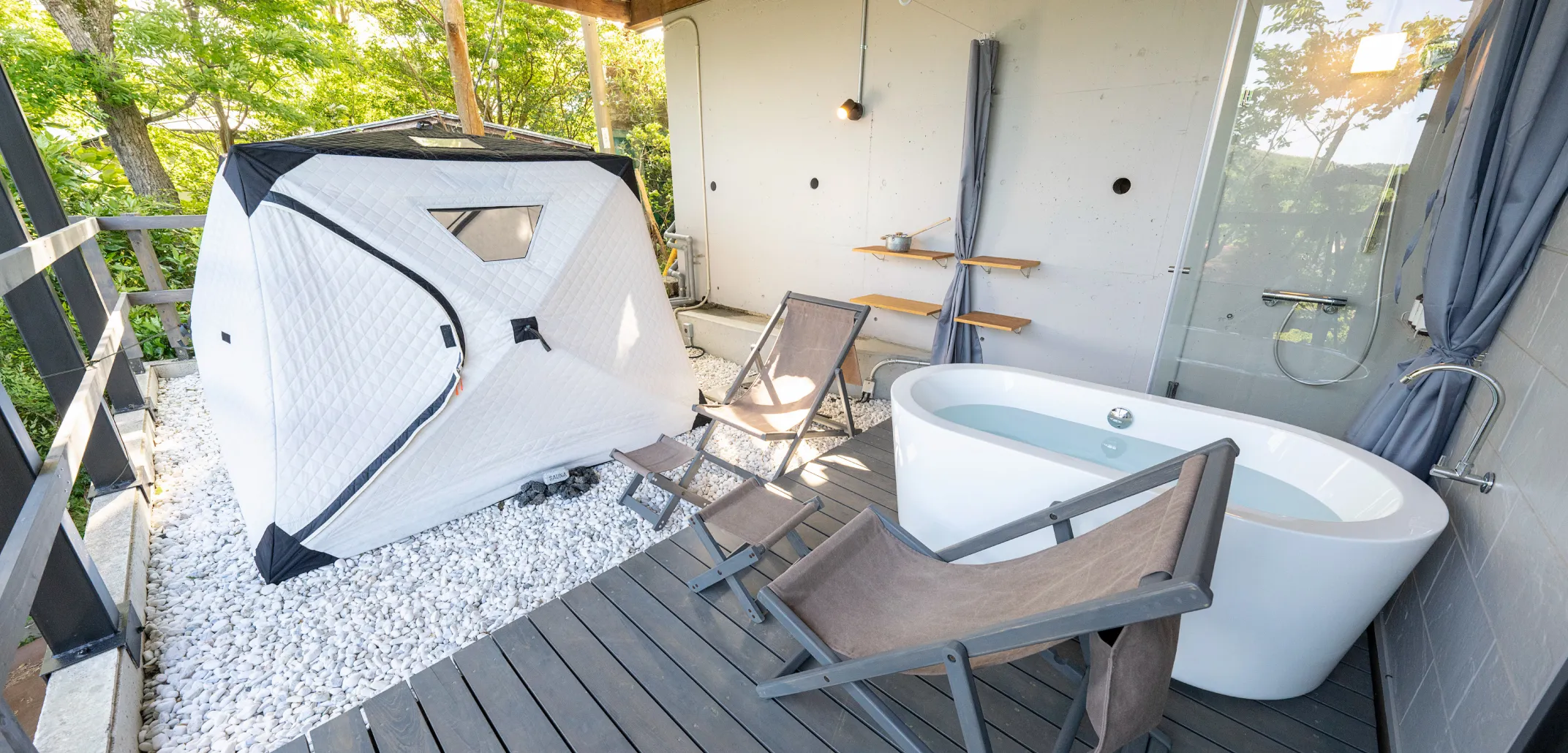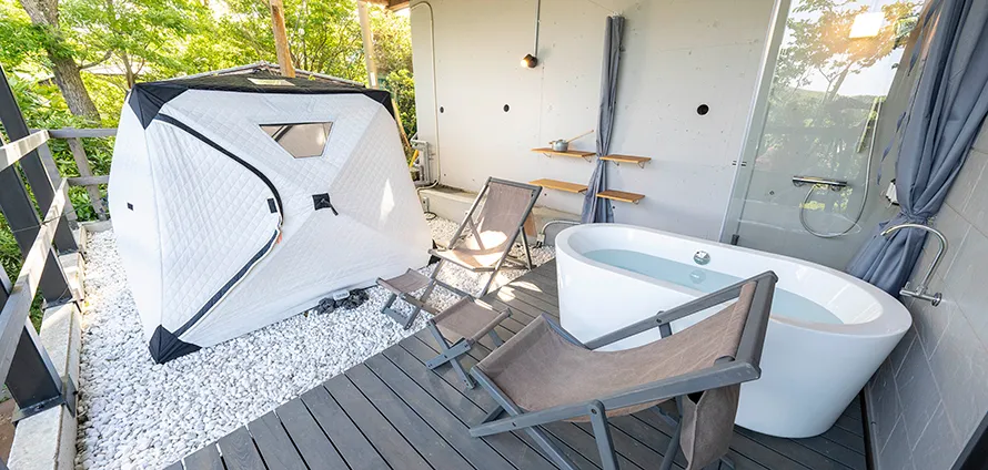 Located beneath the BBQ terrace, the sauna terrace includes a sauna tent, open-air bath, and shower room. This private space allows you to enjoy hot and cold bathing in comfort, with a view and without worry of being seen. It’s roofed, so you can even enjoy it on rainy days.