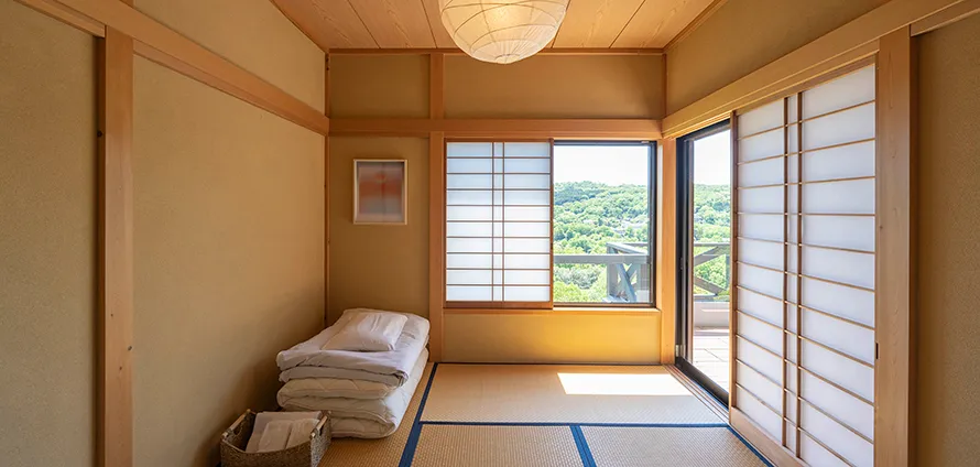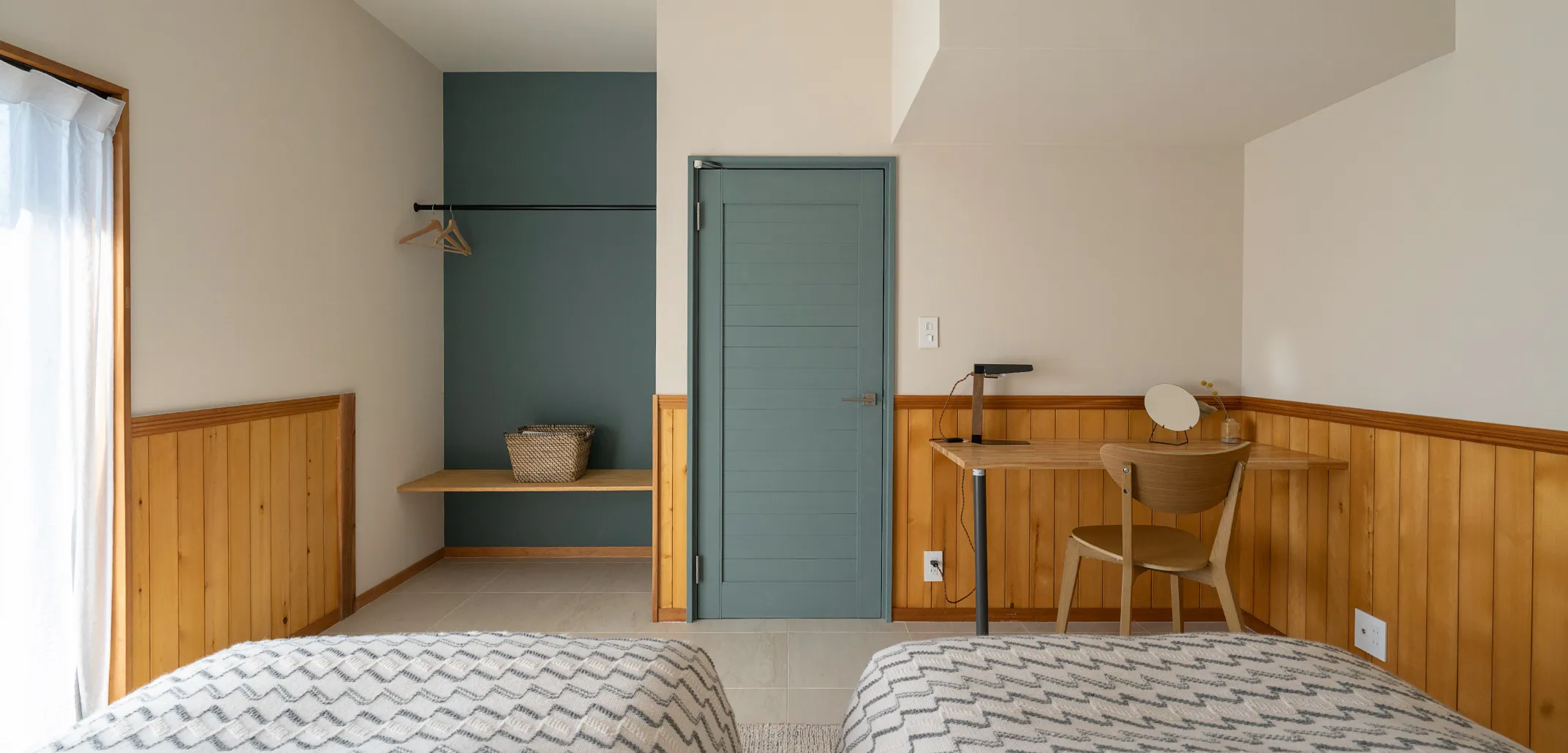This special twin bedroom is spacious (9 tatami mats) and includes a work desk. Walls and doors in a lake-inspired blue reflect the waters of Lake Ippeki. Watch the sunrise peek over the ridge—gently waking you into the day.