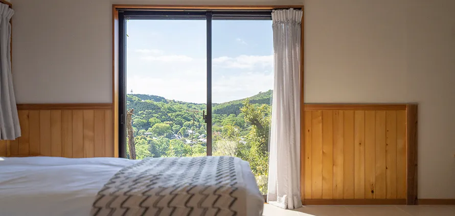 This open-concept bedroom is located beside the sauna terrace and can be separated by curtains. It has easy access to the shower, open-air bath, sink, and toilet—making it the most convenient room. You may even catch the sunset here during check-in time.