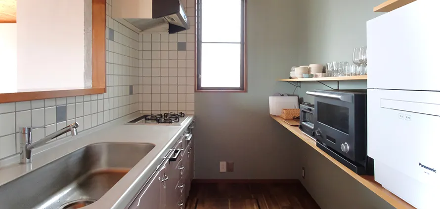 A spacious kitchen ideal for multiple guests, featuring a charming enamel design that we fell in love with at first sight. Fully equipped with a three-burner stove, oven, cookware, and basic seasonings—perfect for preparing your own meals or heating up YAMO’s curated chilled Izu gourmet dishes.