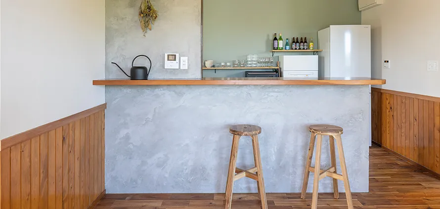 Mounted on a mortar-finished wall handcrafted by the owner is a skull of a wild Izu deer, gifted by a local hunter. Enjoy a local beer at the bar while watching your friends cook in the kitchen—it’s the perfect gathering spot.