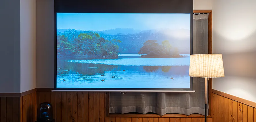 Spanning over 20 tatami mats, the living room features generously sized furniture for group comfort. A projector is installed beside the sofa, and a 100-inch screen can be lowered to instantly turn the space into a private theater