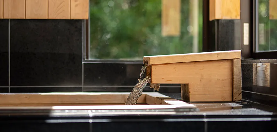 Relax and soak up to your shoulders in the large, deep tub made from fragrant cypress wood. Spacious enough for two people, the bath also has a wide window offering views—perfect for daytime bathing.