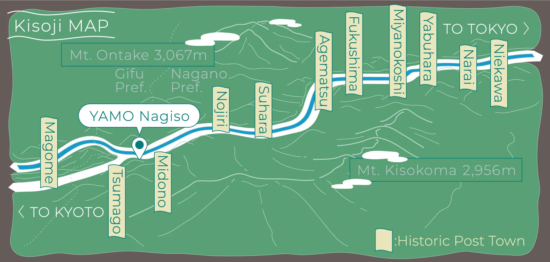 Nagoya IC → (60 min via Tomei & Chuo Expressways) → Nakatsugawa IC → (30 min via Route 19) → Nagiso Town → YAMO Nagiso