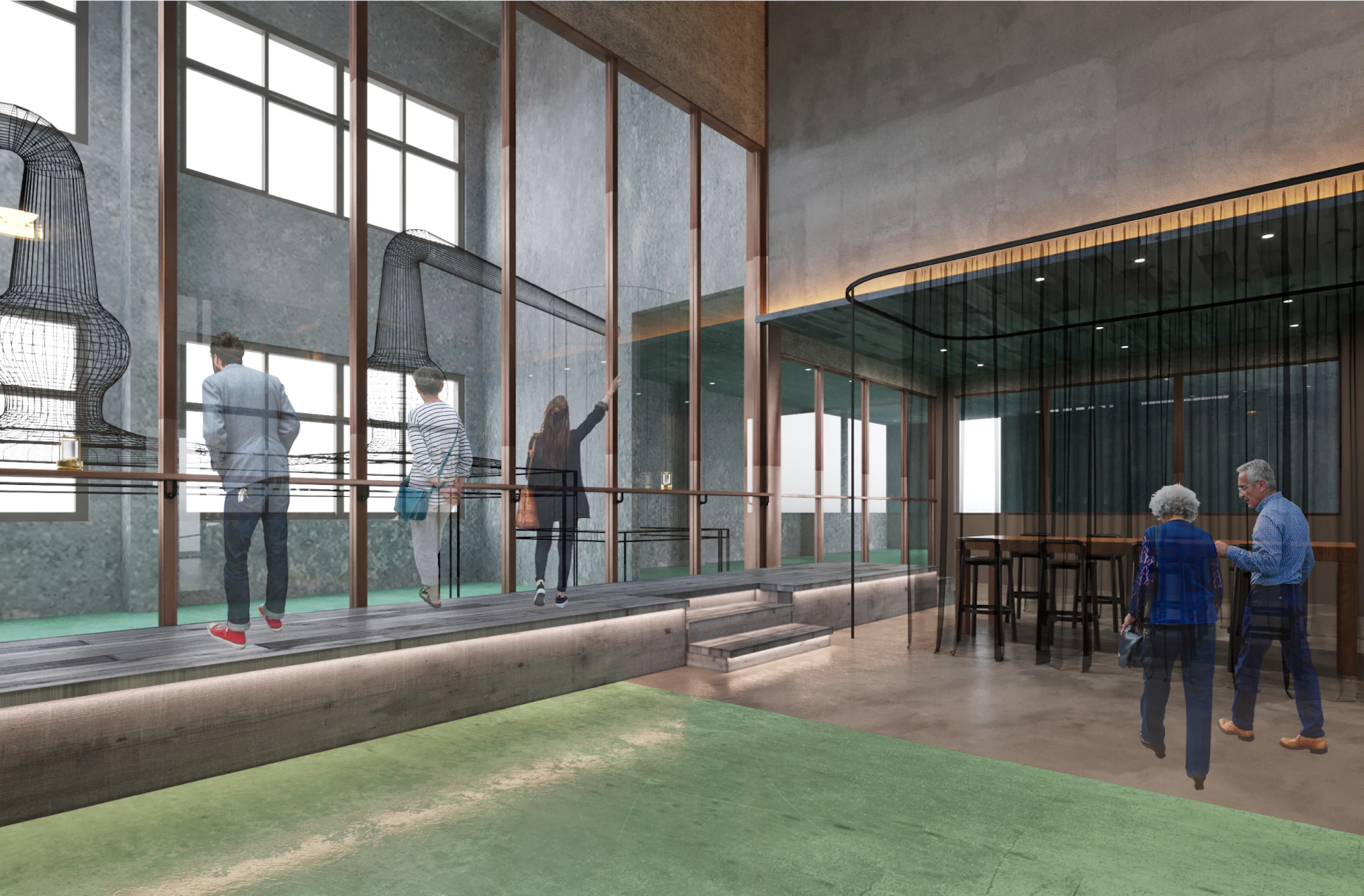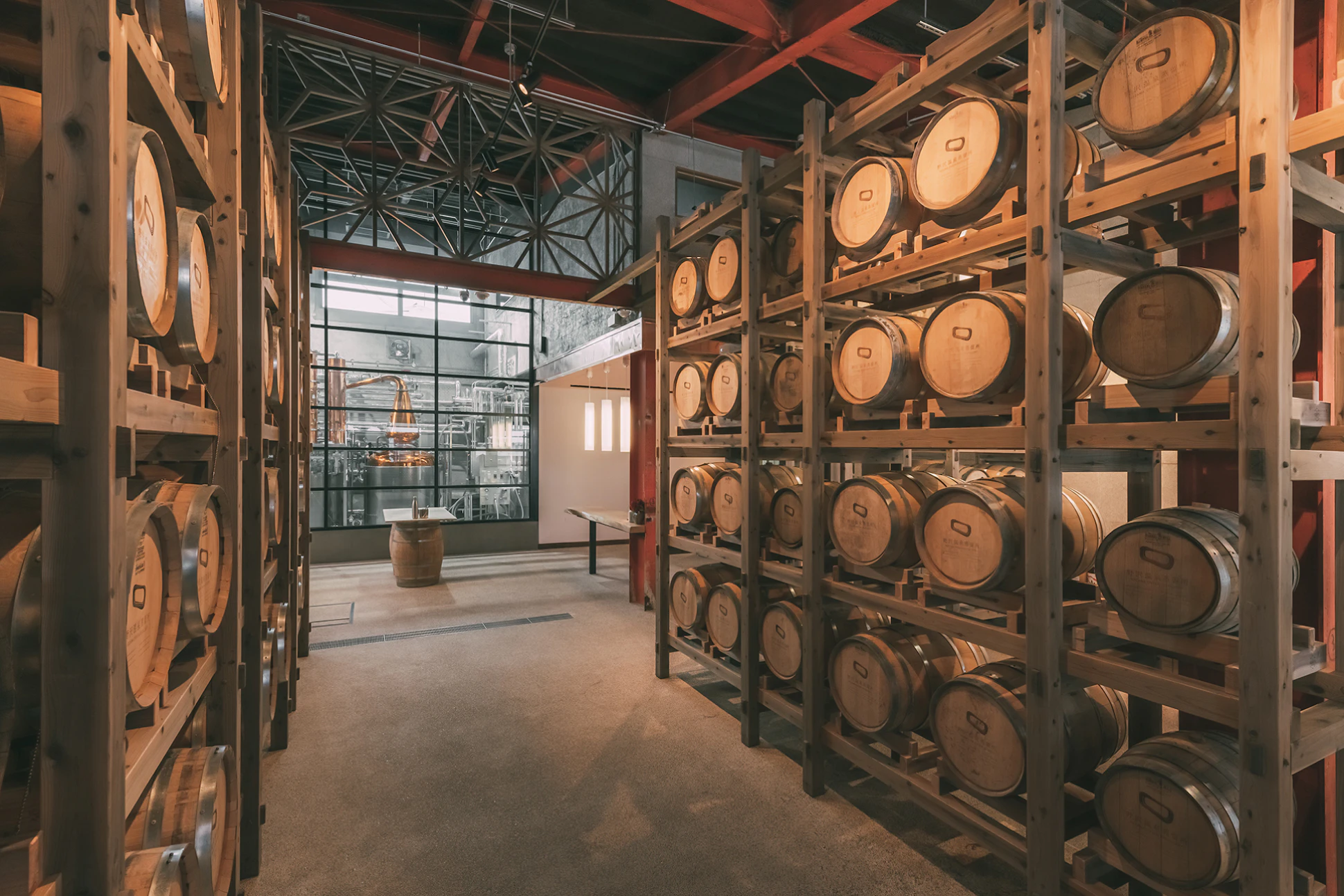 風情ある温泉街から建物に一歩入るとまず、 迫力のあるボトルラックに囲まれます。そして目線の先、ガラス越しに巨大な蒸留設備が現れます。空間全体でこの非日常的な体験を後押しできるように設計しました。