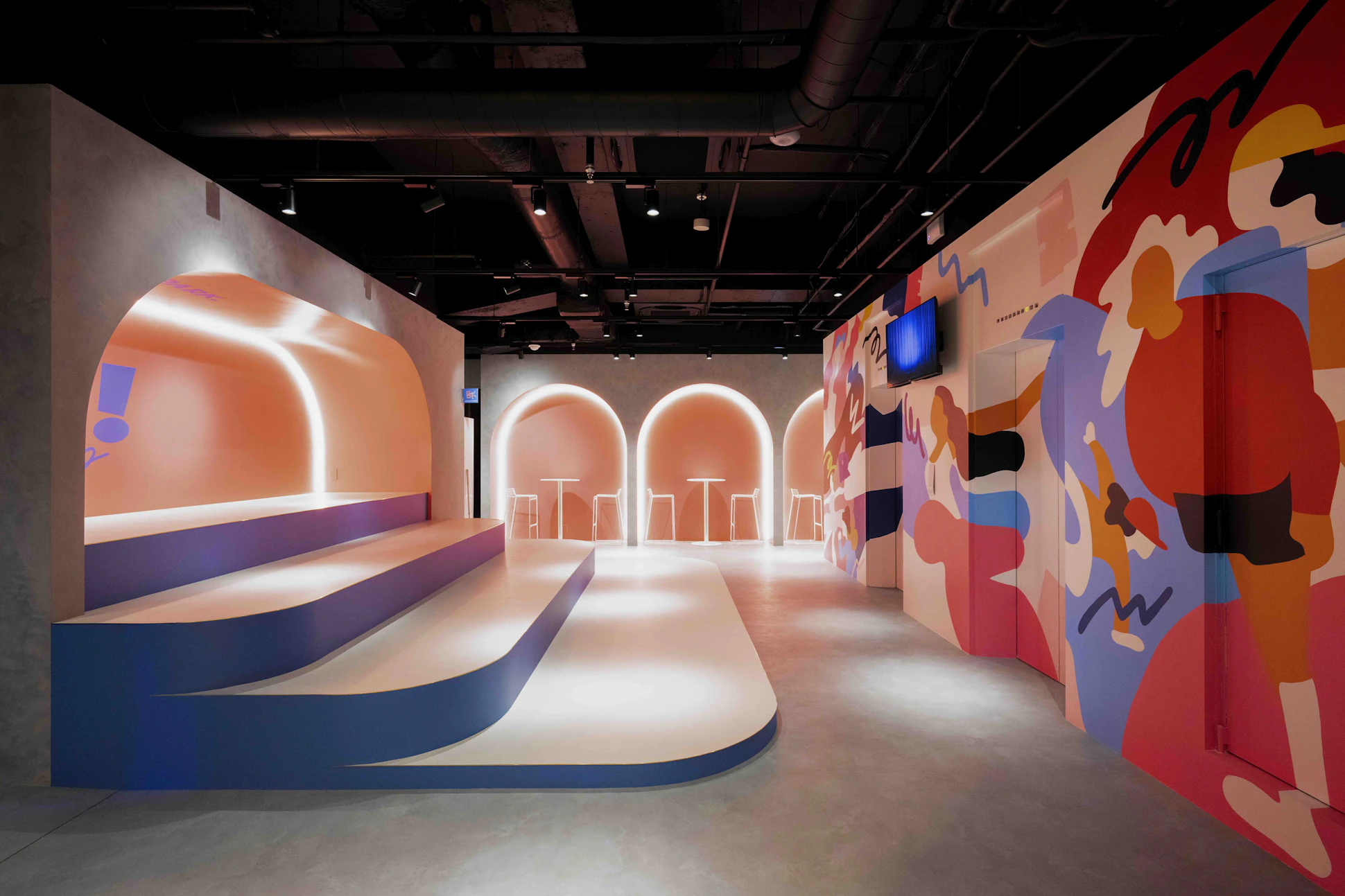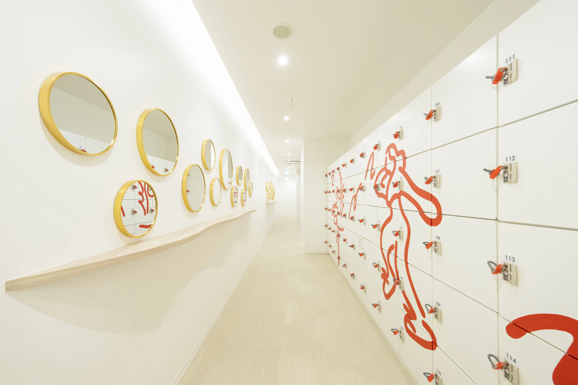 レッスン後に講師との会話を楽しめるバーカウンターのような受付や、自然に各エリアへ歩みが進むようなこだわりの照明計画など、単なる“練習の場”ではなく、ダンサーにとって日常の中の特別な場所となるような設計としました。