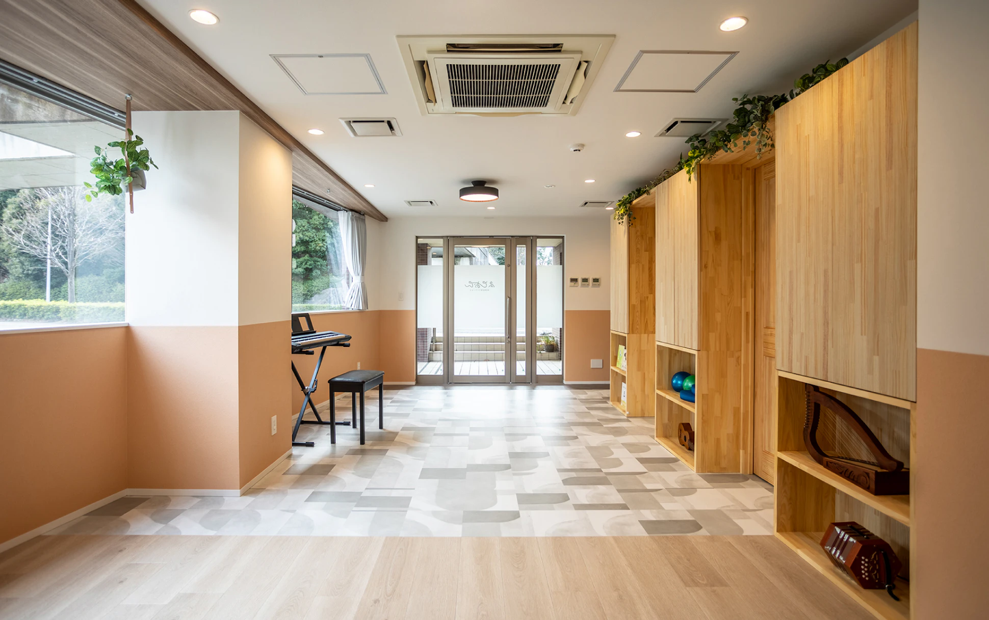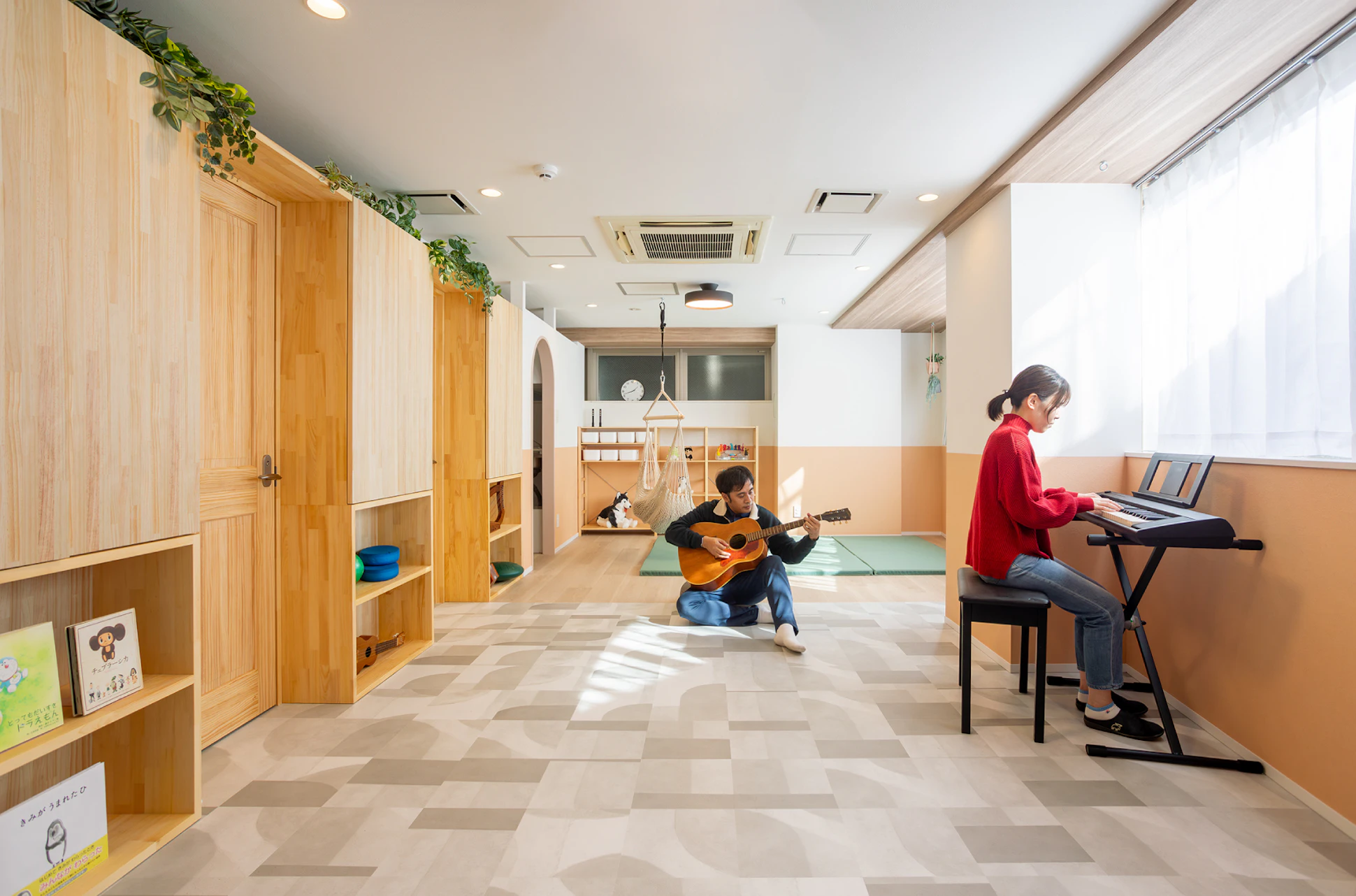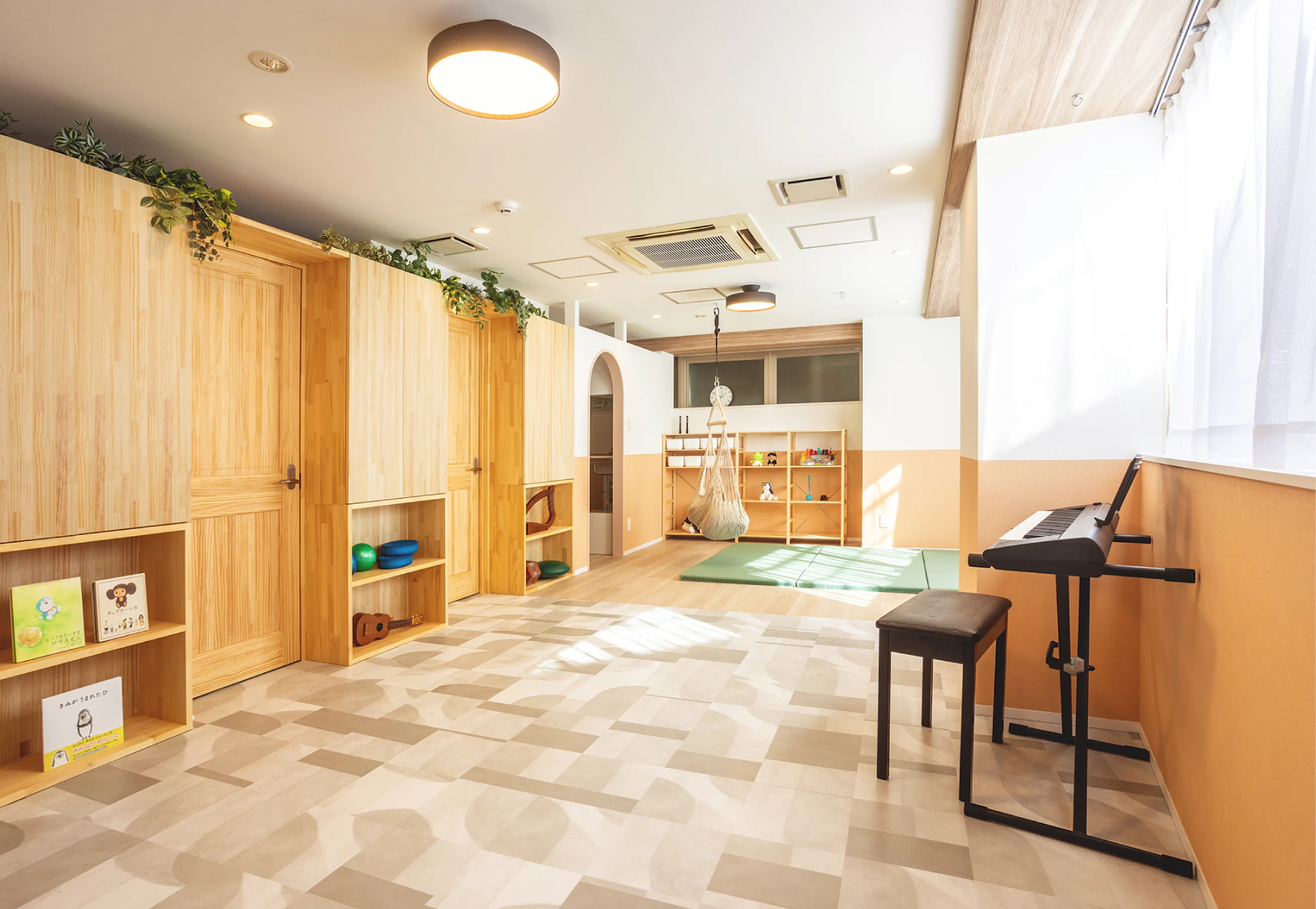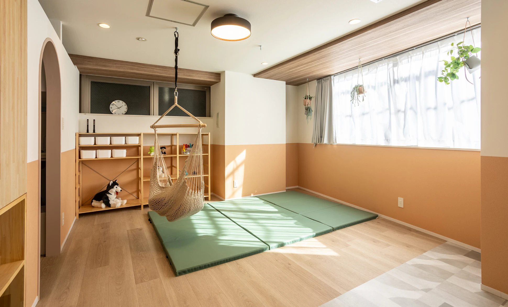 横浜市にある放課後等デイサービス施設。大規模マンションの1階に位置し、大きな柱のある細長いテナント区画。開口部が多く明るい長所を生かし、優しいベージュピンクやラワン材の温かみをポイントにしながら、学校と自宅の間の時間を利用者の子供達がリラックスして過ごすことのできる場所を目指して計画しました。重度の障がいを持つ子供達は床で過ごす時間が中心です。低い位置におもちゃ棚を設け、床材を切り替え空間にメリハリを付けるなどして子供たちの目線での快適さに配慮して設計を行いました。