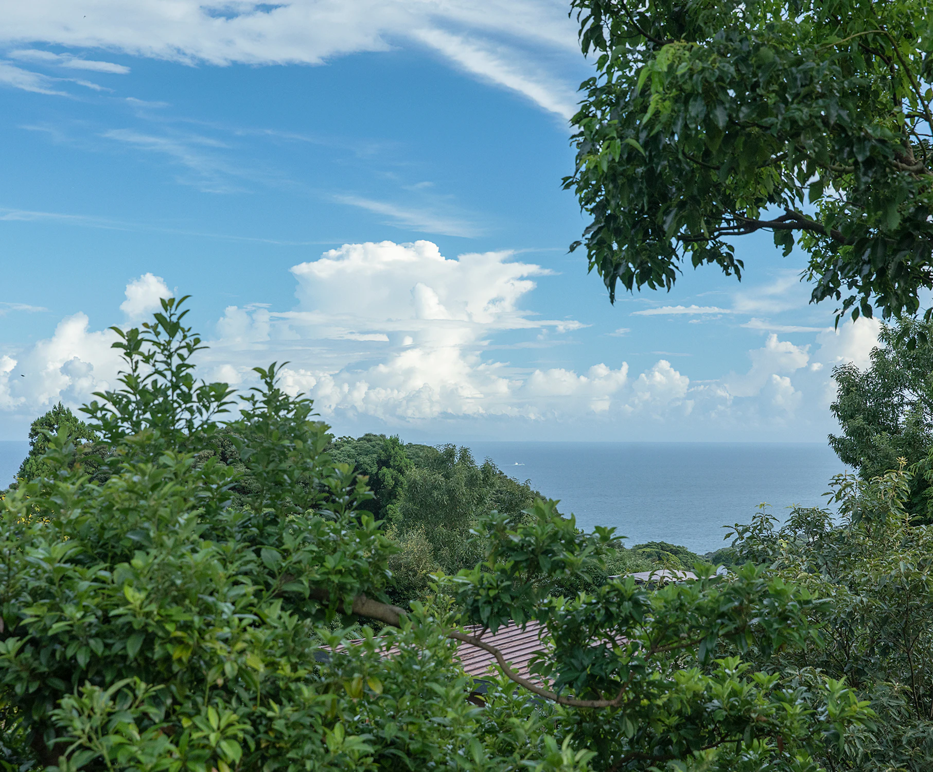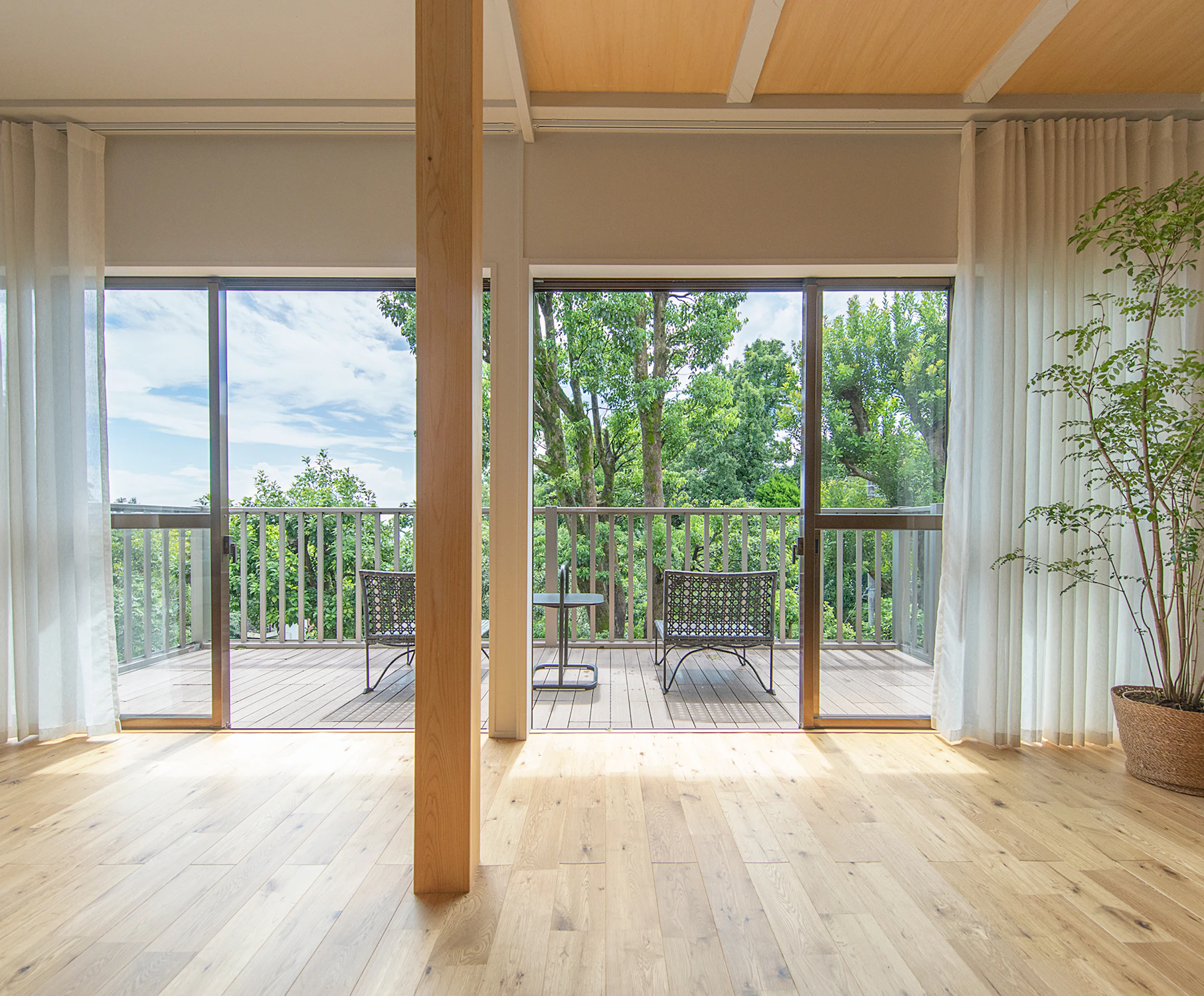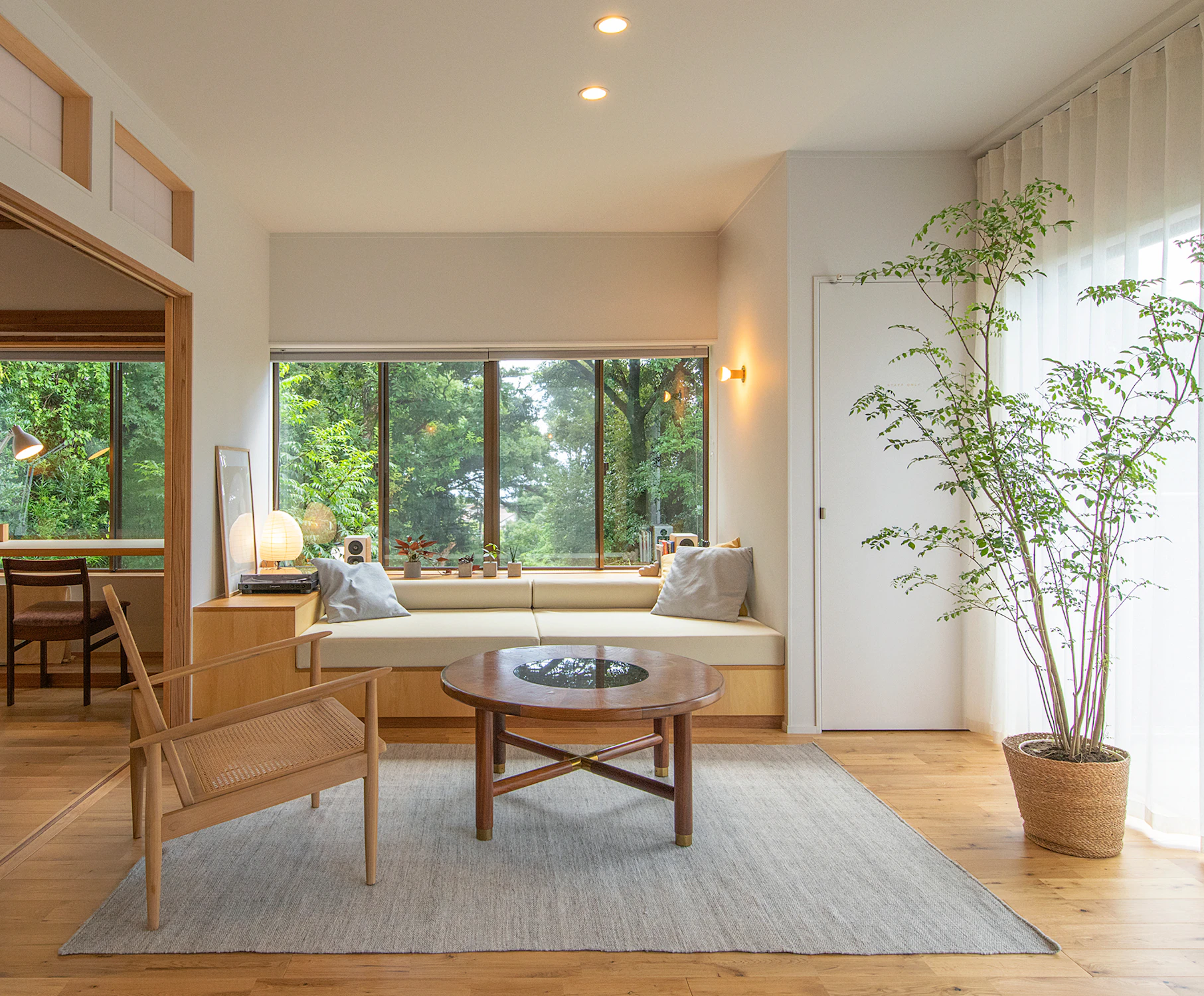 リビングやキッチンを開放的に再設計し、タイルや擬似梁など既存の要素を生かしたシンプルでモダンな内装が特徴です。窓辺には伊豆七島を臨むソファを配置し、バルコニーや庭と緩やかに繋がるレイアウトにより、自然を身近に感じる設計となっています。