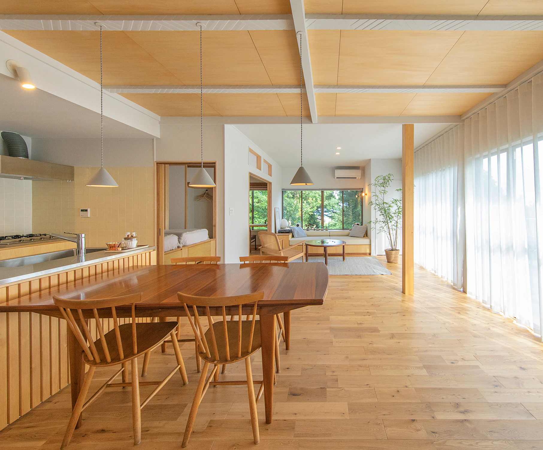 伊豆高原に位置する、最大5名が宿泊可能なコンパクトながらも機能的な一棟貸し宿。1960年代に建てられた田の字型に間仕切られた和風別荘をリノベーションし、家族や友人との旅行に最適な宿を実現しました。