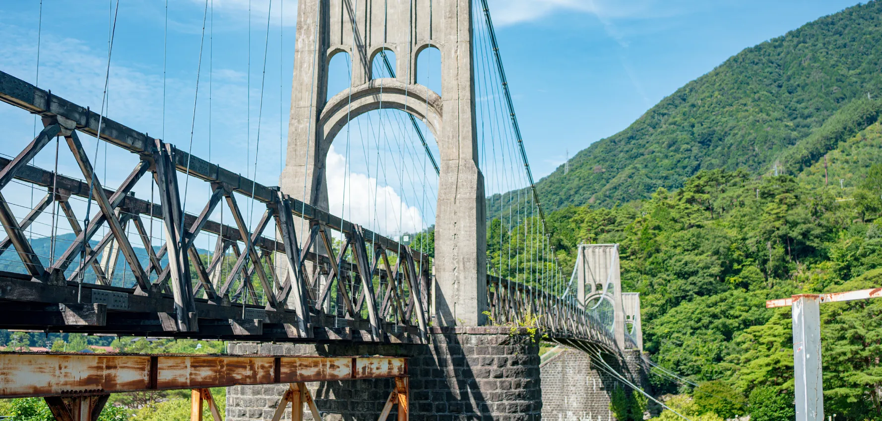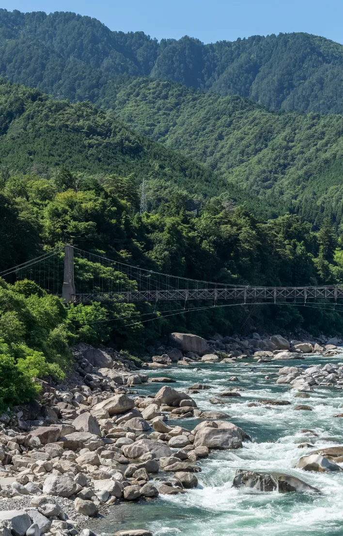 大正時代に架けられた木製の吊り橋で、重要文化財にも指定されています。 もとは発電所の建設にあわせて整備されたもので、当時の技術の粋が詰まっています。 眼下には木曽川の清流が広がり、歴史と自然の両方を感じられる、宿からのお散歩にもぴったりのスポットです。