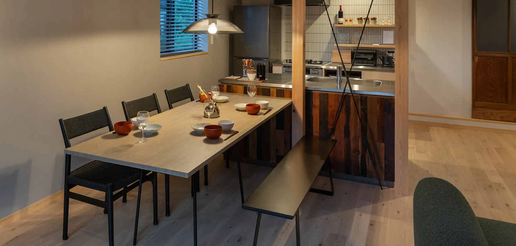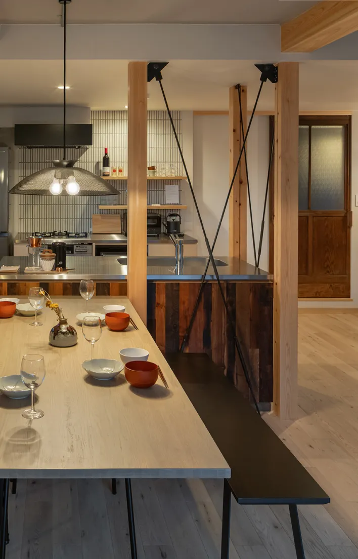 キッチンとひと続きのダイニングには、6人がゆったりと座れるテーブルを設置。県内で手に入れた古材やヴィンテージライトが空間のアクセントに。食事や会話を囲んで、思い思いの時間をお過ごしください。
