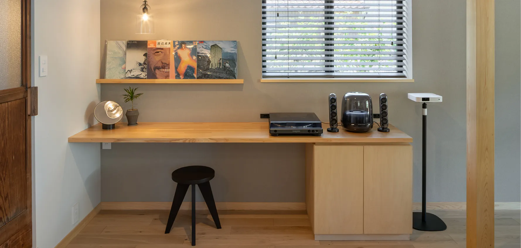 飾り棚には、ジャズベーシストでもあるオーナーセレクトの、季節に合わせたレコードコレクションをご用意しています。備え付けのレコードプレイヤーで音色に包まれてみてください。
