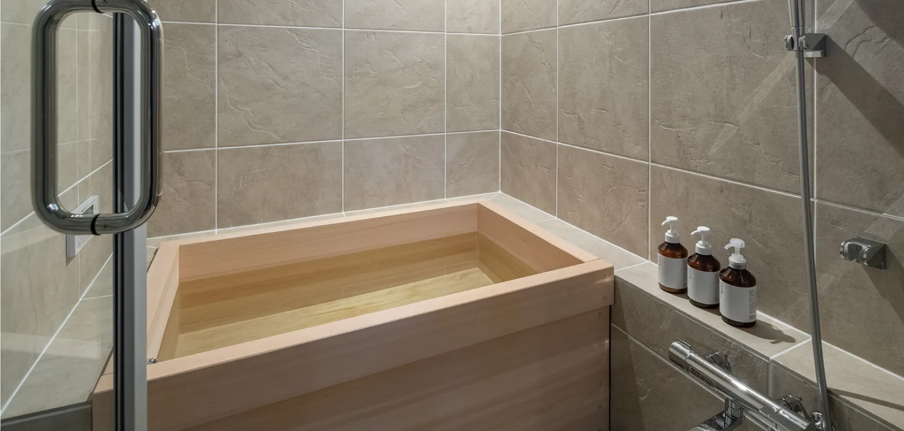 ヒノキの香り漂う、大きくてしっかり深い浴槽に肩まで浸かり旅の疲れを癒やして。2名での入浴も可能なゆったりしたバスルームです。明るく開放感のある浴室で、日中の入浴もお勧めです。
