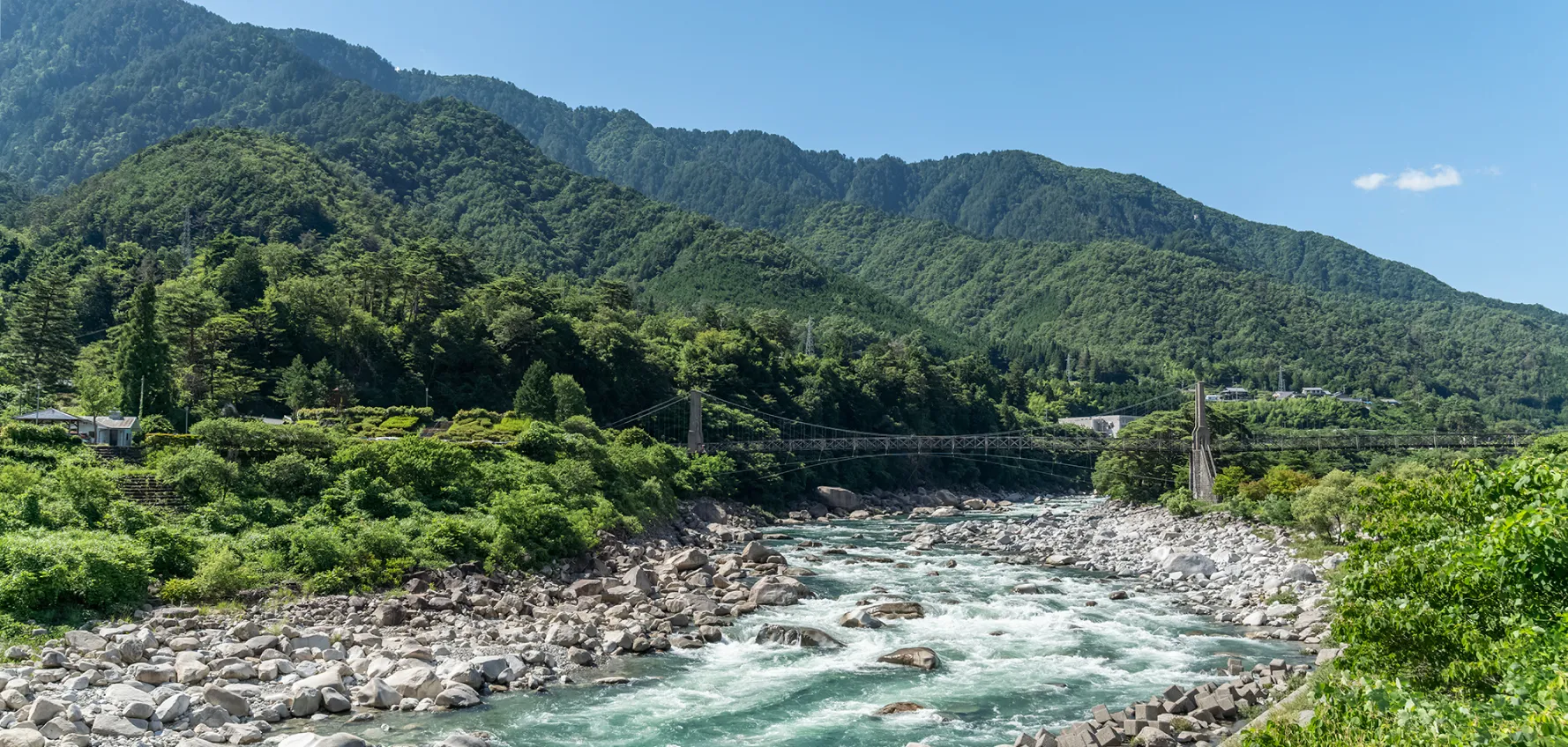 エメラルドグリーンの清流と美しい渓谷美を誇る、南木曽の人気スポット・阿寺渓谷。 車で約15分の場所にあり、川沿いの散策や夏の水遊びなど、季節ごとの楽しみが広がります。