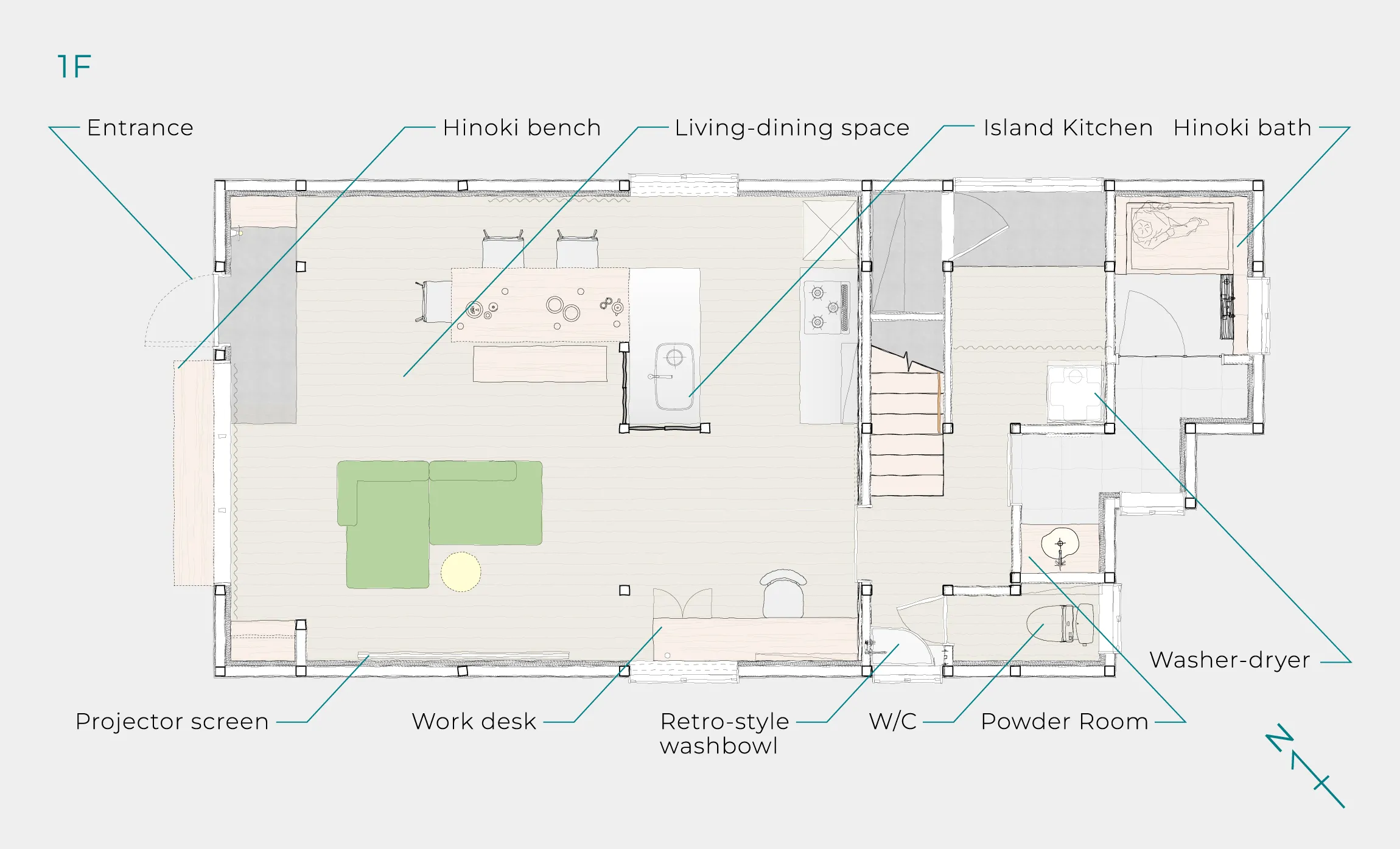 かつて車庫だった場所を、街に向かって開かれたリビングに再構成。旅人を迎え入れるリビングとして再生された空間には、かつて人とモノが行き交った名残が静かに息づいています。